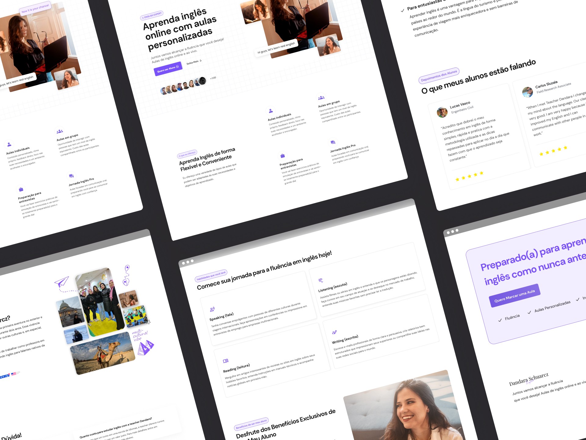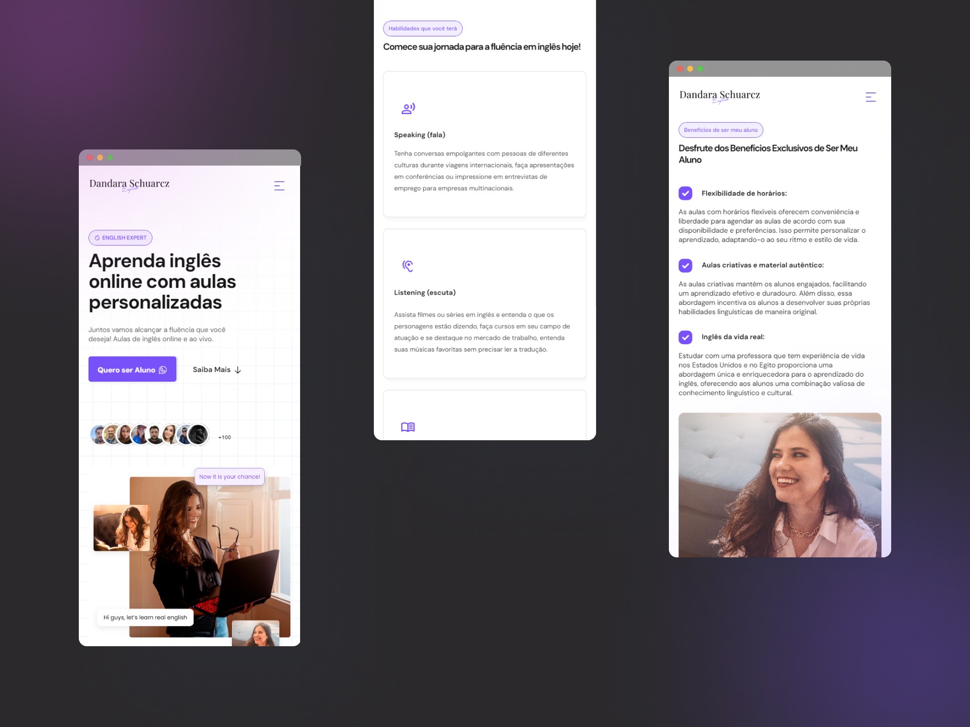 My goal with this project was to create an engaging and user-friendly page for an English teacher, Mrs. Dandara Schuarcz, to connect with potential students, highlight her expertise, and facilitate communication.