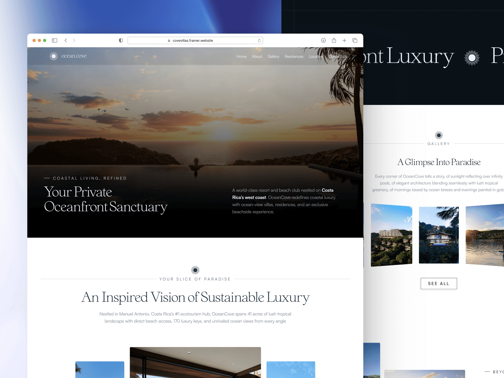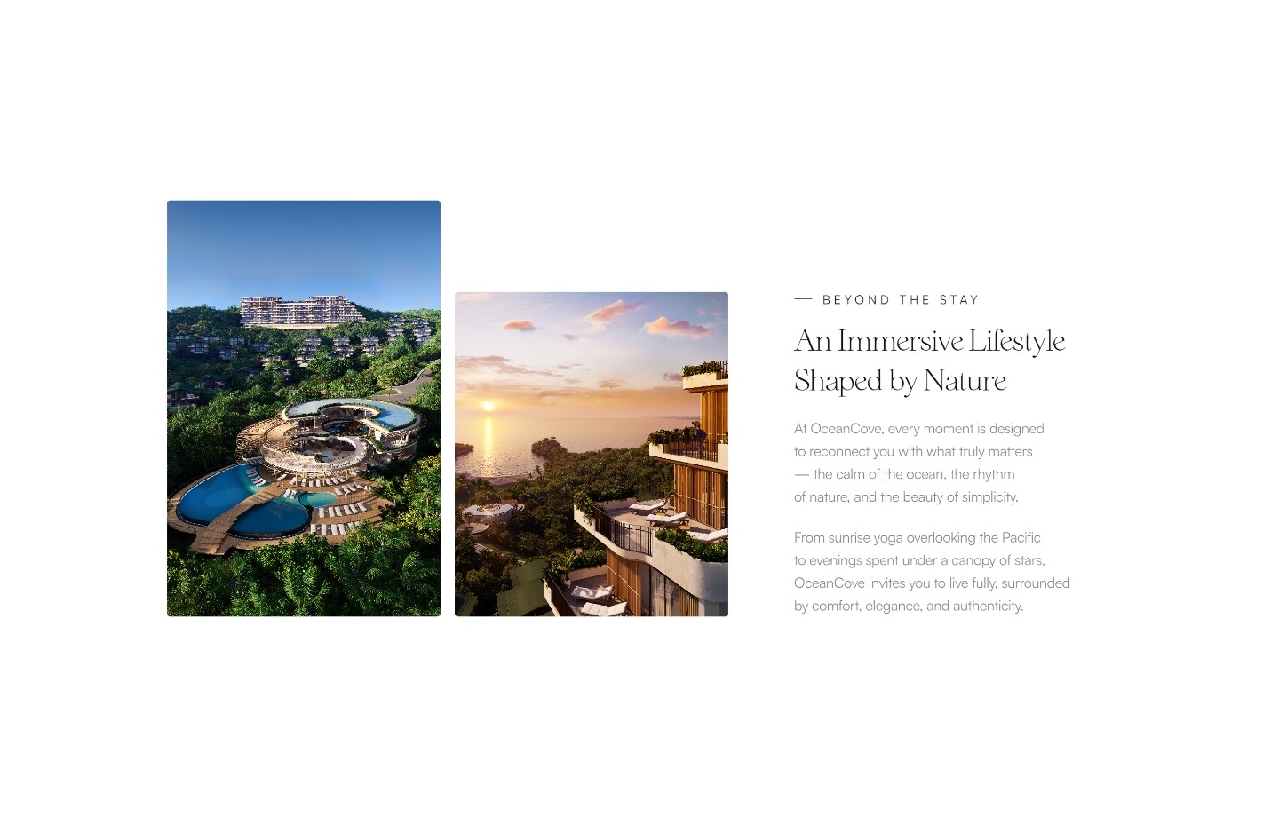 The final product delivered an elegant, high-performing website that aligned with OceanCove’s vision of luxury, sustainability, and exclusivity. The Framer build provided both flexibility and long-term scalability, allowing the marketing and investor teams to keep the site updated with minimal effort while maintaining brand consistency.